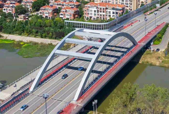 愚公橋位于滕州市荊泉路(主干道)跨越荊河河道處,橋梁全長146米,寬36米,100米主橋采用下承式鋼箱拱,兩端20m引橋為先張法預應(yīng)力簡支板梁橋。此橋是滕州市第一座大跨度鋼結(jié)構(gòu)橋梁,同時,我們充分保留了老愚公橋的原始風貌,并對其進行了加固和重新修繕,形成特有的滕州記憶和城市景觀,已成為滕州市的新亮點、新景觀。此橋由滕州市信華集團權(quán)屬企業(yè)滕州市房地產(chǎn)綜合開發(fā)有限公司投資建設(shè),總造價7000余萬元,此橋于2018年5月開工,并于2019年10月1日順利竣工通車。