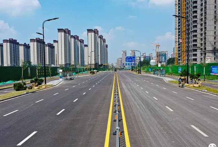 荊泉路全長8300余米,北起紅荷大道,南到騰飛路,貫通解放路,府前東路、夏莊街、青啤大道、騰飛路等主次干道,道路規(guī)劃紅線55米、主車道為雙向6車道、兩側(cè)各1.5米綠化隔離帶,慢車道3米、人行道2米、人行道外側(cè)為10米綠化帶,道路東側(cè)配套設(shè)施有綜合線廊,熱力各一道,道路西側(cè)設(shè)有燃氣、給水、雨水、污水管線。荊泉路于2018年5月開工,2019年10月1日建成通車。全線貫通后有效地緩解了東部城區(qū)的交通壓力,推動東部城區(qū)更好、更快發(fā)展。