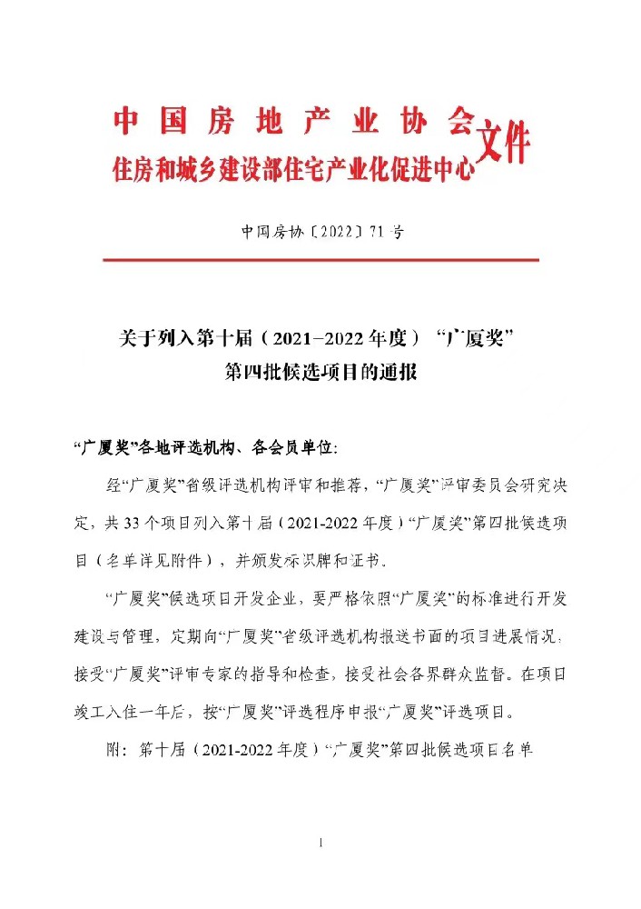 6月9日,中國(guó)房地產(chǎn)業(yè)協(xié)會(huì)印發(fā)《關(guān)于列入第十屆(2021-2022年度)“廣廈獎(jiǎng)”第四批候選項(xiàng)目的通報(bào)》(中國(guó)房協(xié)[2022]71號(hào)),經(jīng)“廣廈獎(jiǎng)”省級(jí)評(píng)選機(jī)構(gòu)評(píng)審和推薦,“廣廈獎(jiǎng)”評(píng)審委員會(huì)研究決定,信華城.琭園憑借科學(xué)的規(guī)劃設(shè)計(jì)、優(yōu)美的居住環(huán)境、扎實(shí)的建筑質(zhì)量以及良好的群眾滿意度成功入選第十屆(2021-2022年度)“廣廈